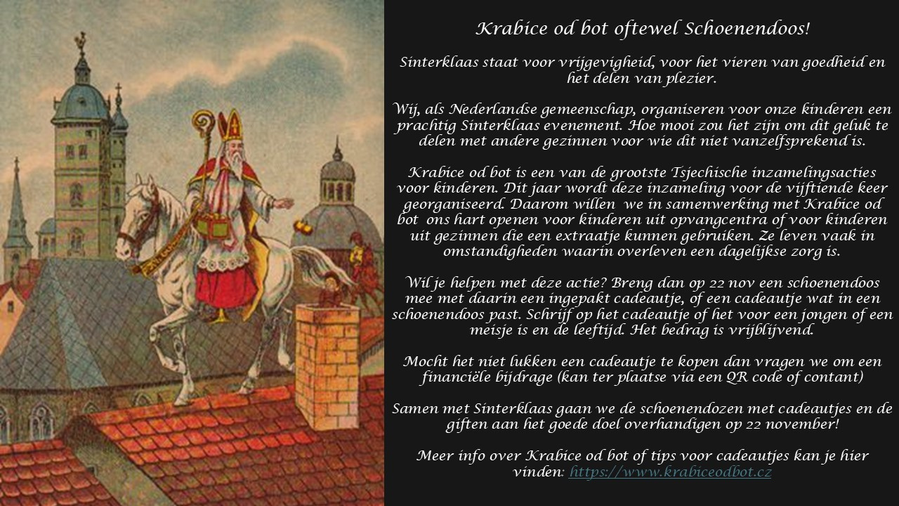 Sinterklaas staat voor vrijgevigheid, voor het vieren van goedheid en het delen van plezier. Vanuit dit gedachtegoed willen we dit jaar het goede doel: www.krabiceodbot.cz steunen. In samenwerking met deze organisatie helpen we kinderen in opvangcentra of kinderen die een extraatje kunnen gebruiken. Meer informatie hierover vinden jullie in onderstaande flyer.